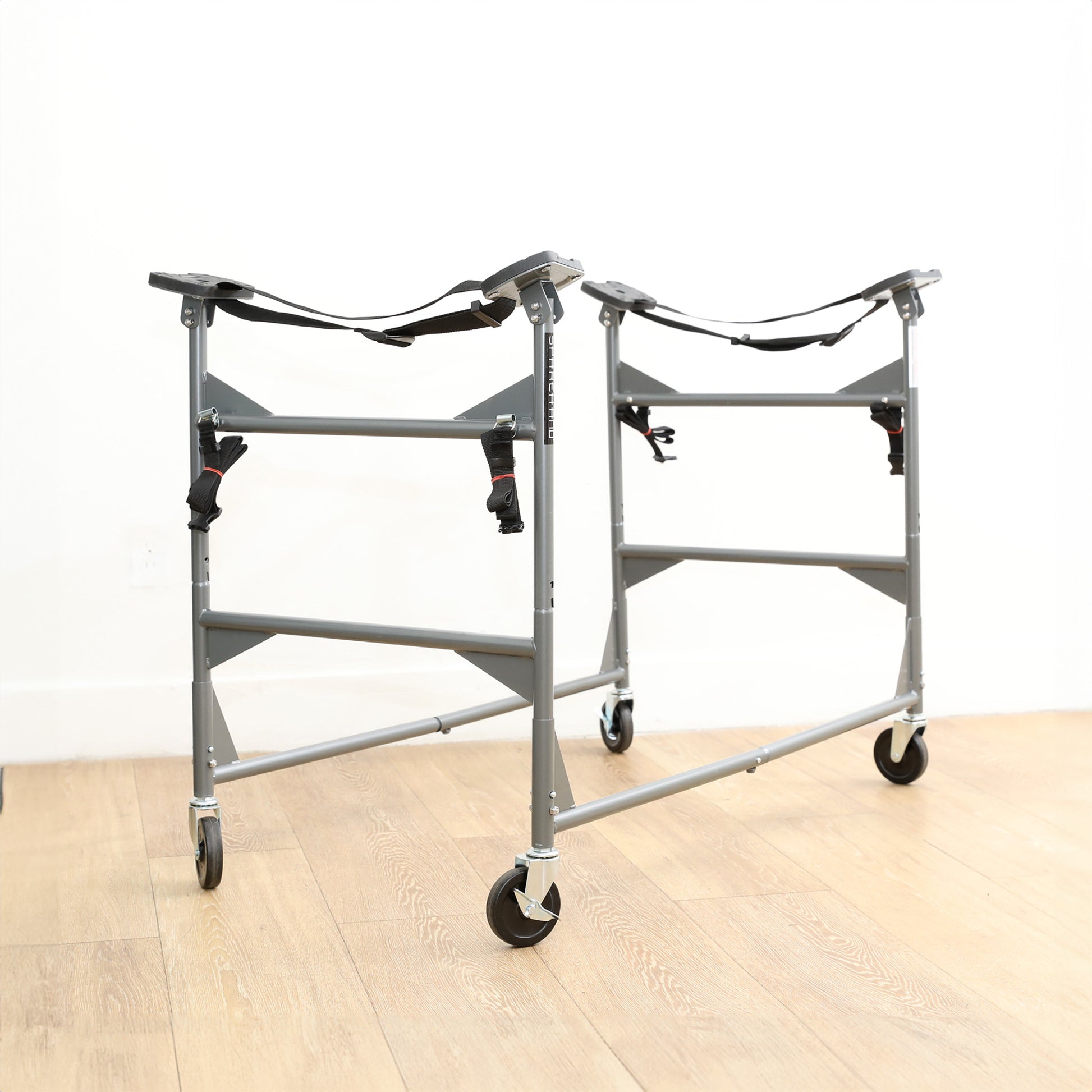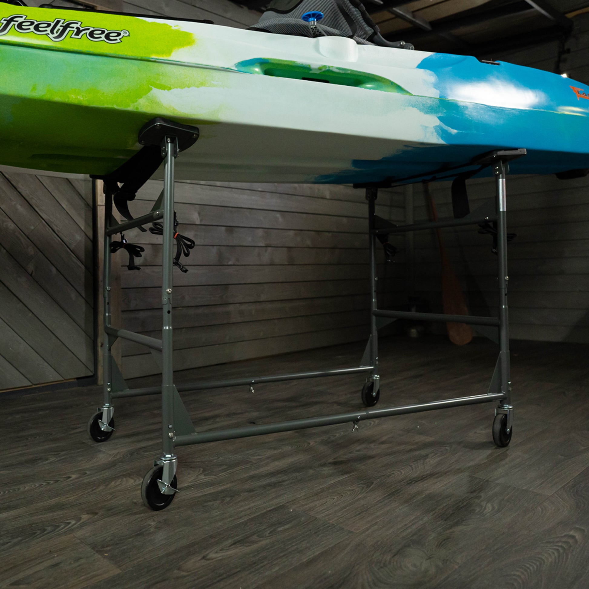 - Raised canoe and kayak rack on wheels for easier rigging, maintenance, and loading