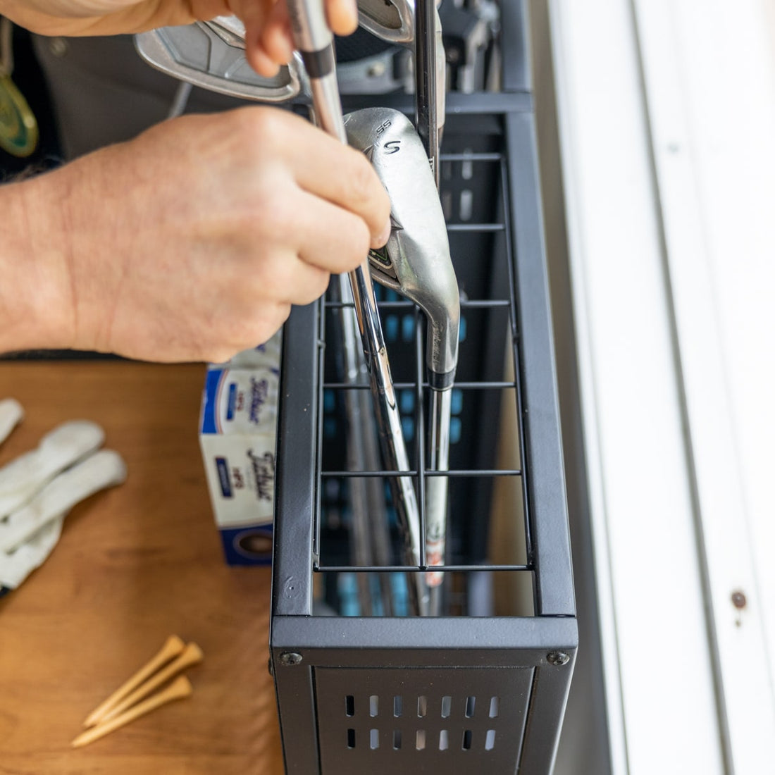 Made with real hardwood and solid steel, this double-sided golf storage rack organizes all your golf essentials and looks good doing it. Give your golf gear a dedicated home so you can both stay at the top of your game.