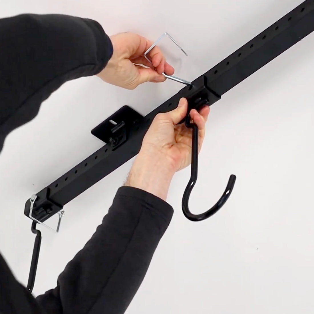 - Easily adjust hook positions along the bar, then secure in place with heavy-duty gated pins
