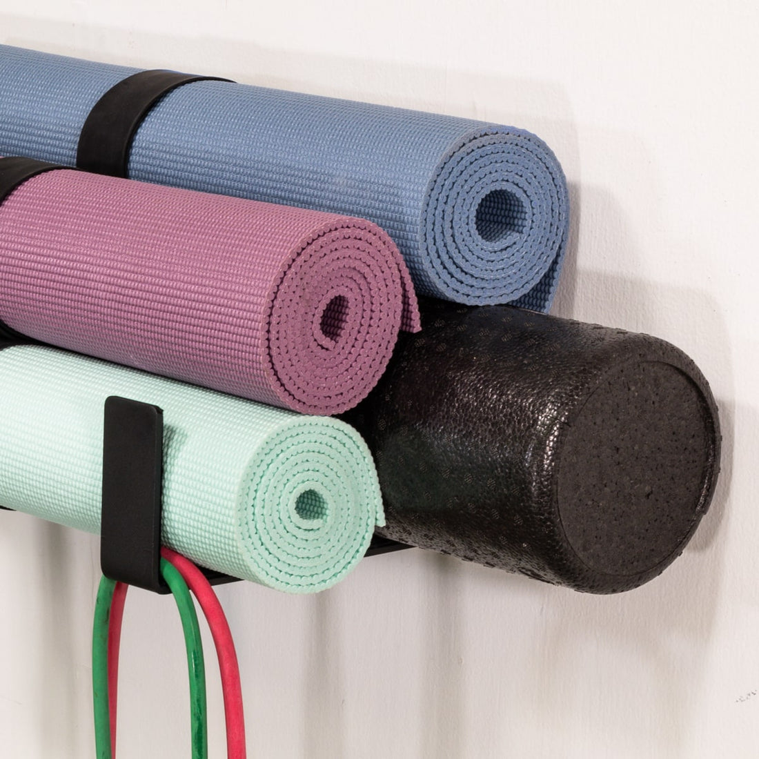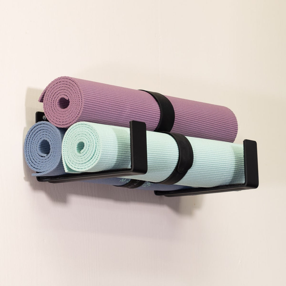 - Extra large yoga mat storage rack holds up to 3 mats or foam rollers